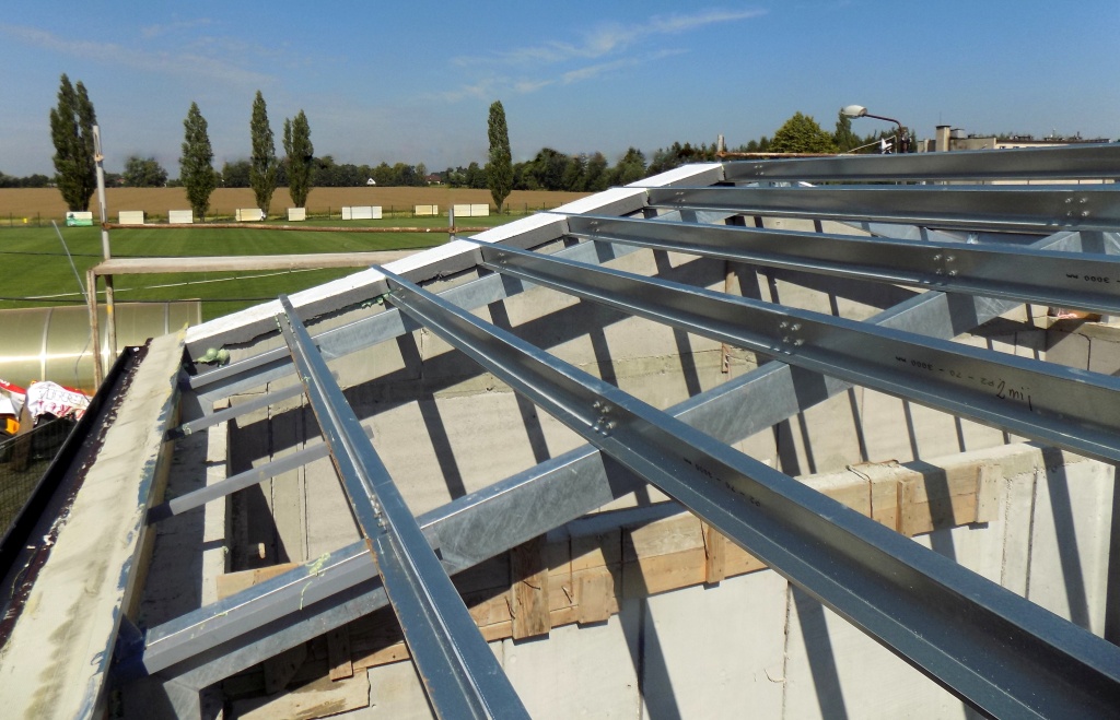 - wykonanie stalowej konstrukcji dachu z poszyciem z blachy trapezowej i ociepleniem